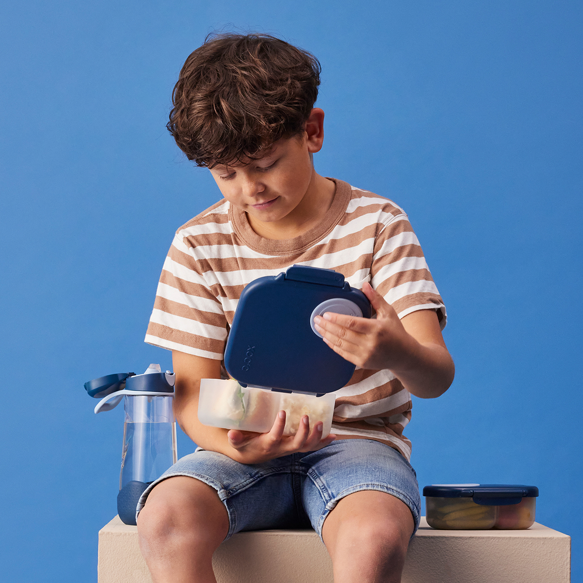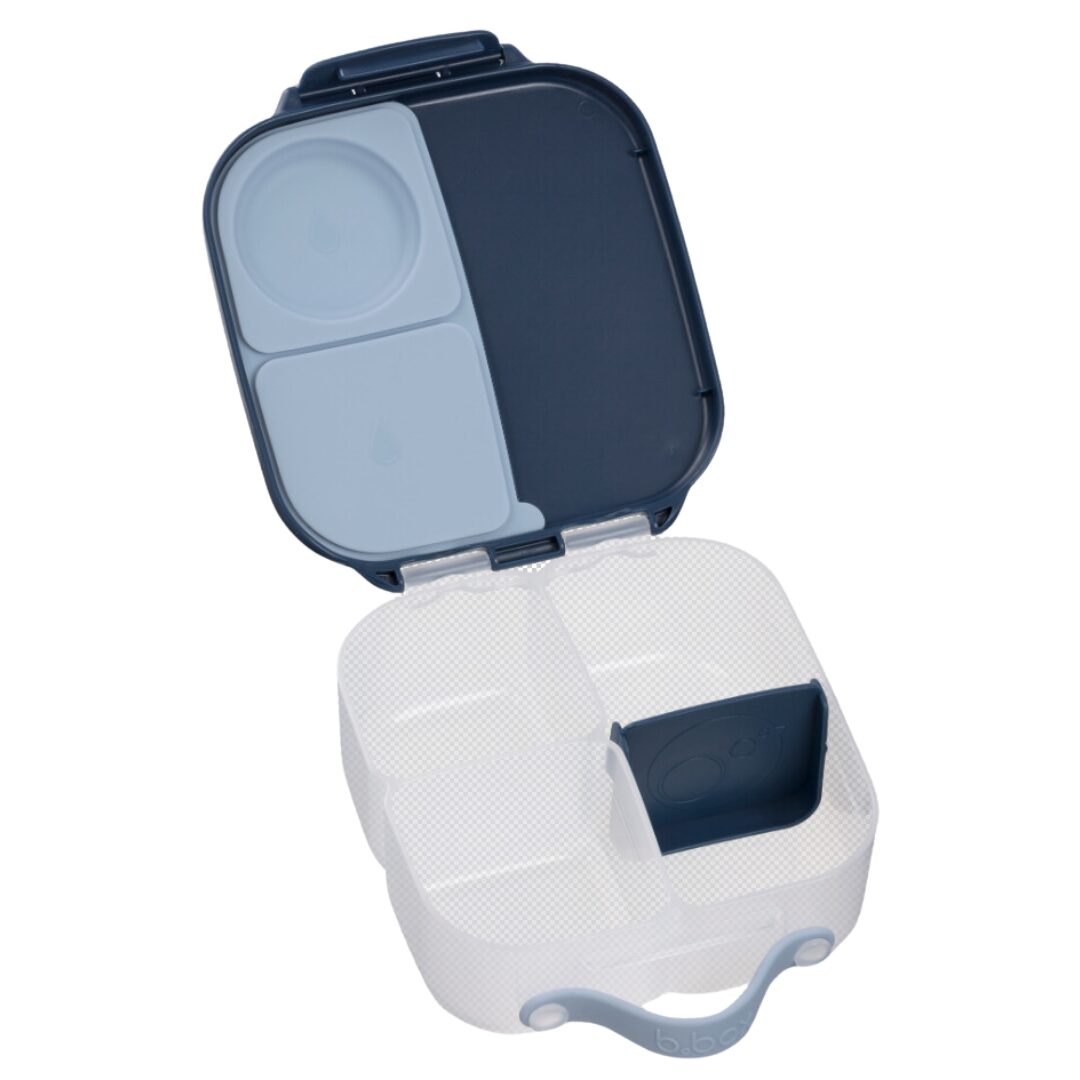 b.box mini kutija za ručak možda je kompaktna, ali ima mnogo mjesta za zdrav obrok. Fleksibilan poklopac za voće rasteže se tako da je voćka zaštićena unutar posude. 2 odvojena nepropusna pretinca zatvaraju se zasebno, pa pakiranje suhe i tekuće hrane u istoj posudi više nije problem. Pomična pregrada može se prilagoditi ovisno o vrsti i veličini obroka koje vaše dijete pojedini dan nosi. Integrirana ručka olakšava vađenje iz torbe, a velika kopča olakšava malim prstima otvaranje i potiče ih na samostalnost. Svi dijelovi se mogu skinuti i oprati.