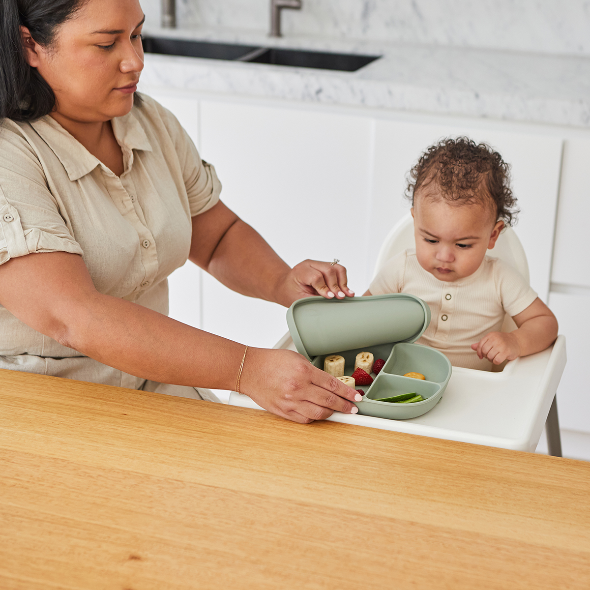 Podijelite, osigurajte, grickajte i poklopite. Naš obožavani silikonski tanjur s poklopcem nezaobilazna je oprema za vrijeme obroka za prelazak beba i male djece na samostalno jelo. Dizajniran za praktičnost, funkcionalnost… i stil!