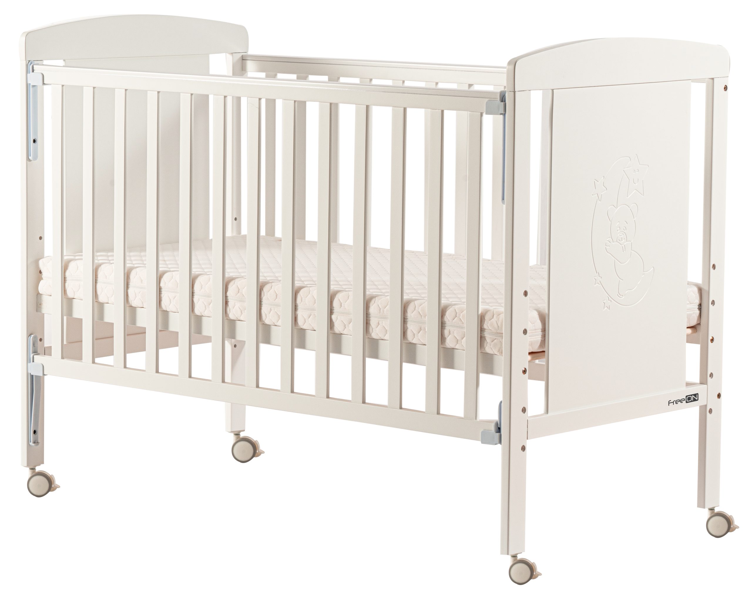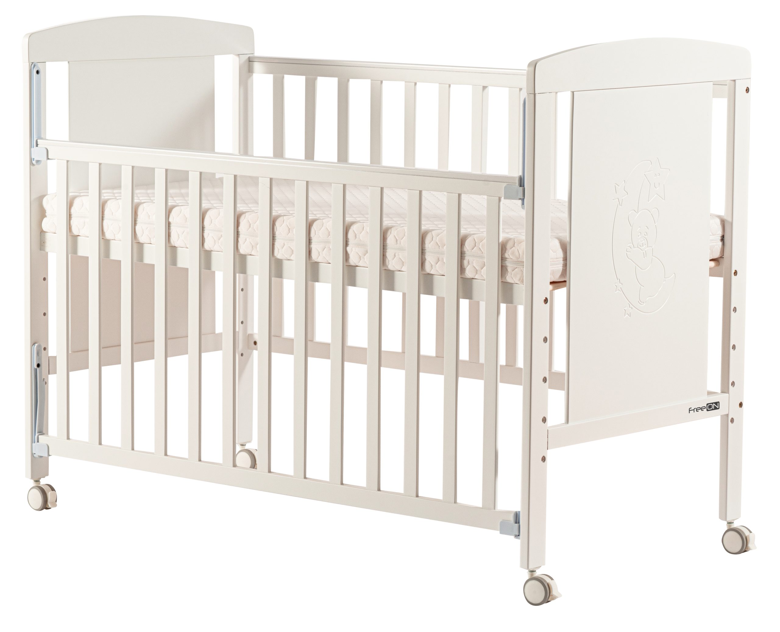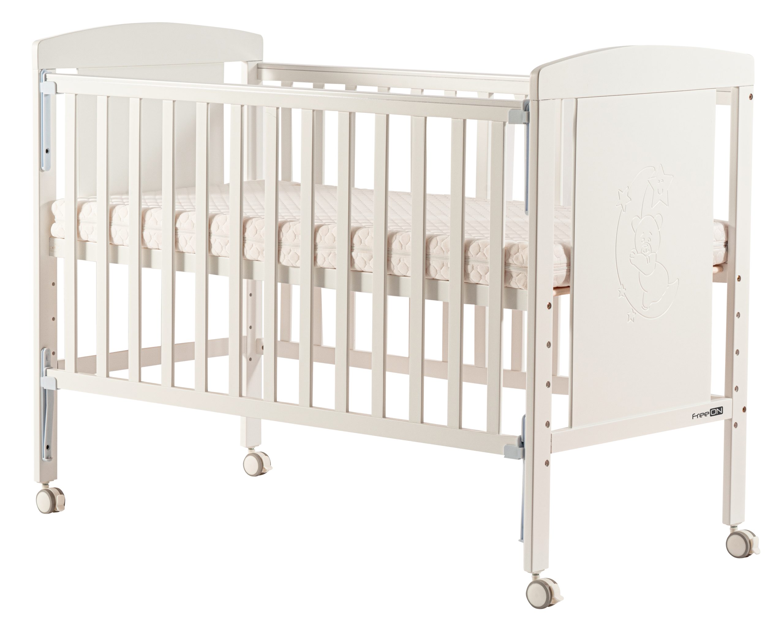 Prekrasan krevetić FreeON Mia nudi sigurnost i udobnost djetetu tijekom dužeg perioda. Dno krevetića može se namjestiti na 4 različite visine, što roditeljima olakšava podizanje i stavljanje bebe u krevetić. Bočna stranica kreveta je pomična i podesiva u dvije visine. Četiri kotačića dodana su za lakše kretanje. Svoji izgledom krevetić se uklapa u svaku prostoriju. Pogodan je za madrac 120×60 cm (madrac nije uključen u cijenu).