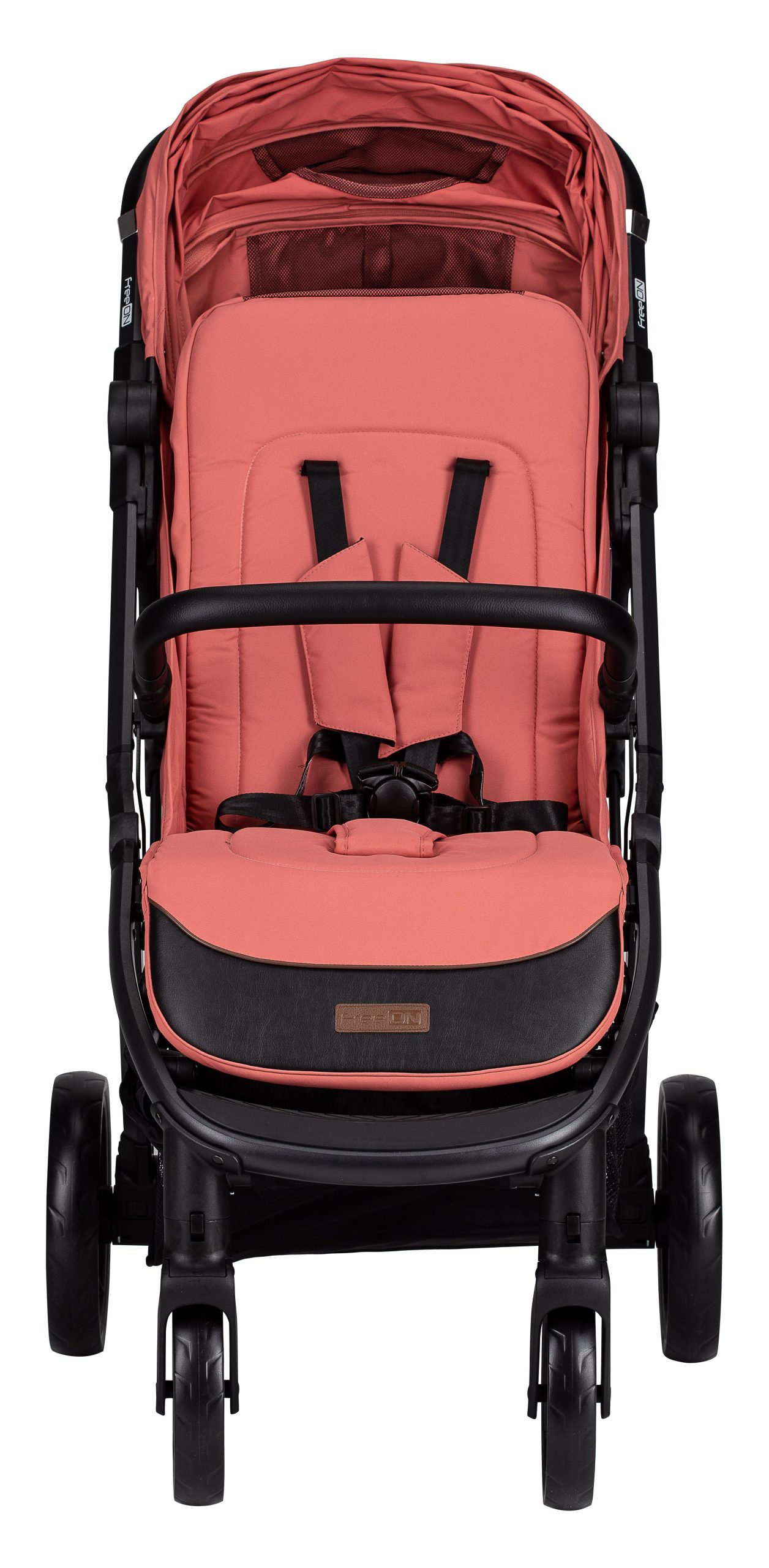 Upoznajte sportska kolica FreeON Dynamic, potpuno nova, lagana kolica prikladna od rođenja do 22 kg. Pritiskom tipke na ručki, kolica Dynamic se automatski sklapaju u veličinu za ručnu prtljagu, tako da su idealna za putovanje s djetetom. Mehanizam za automatsko sklapanje također je idealan za užurbani stil života kada je potrebna dodatna ruka. Kolica su samostojeća kada su sklopljena, što omogućuje da se djetetu posveti sva pažnja. Svestrana amortizacija na kotačima osigurat će ugodnu vožnju. Naslon za leđa može se namjestiti u 3 različita položaja, a omogućuje potpuno ležeći položaj. Na taj način se djetetu osigurava pravilan i siguran položaj za opušten odmor. Sigurnosni pojasevi u 5 točaka i prednja zaštita prečka osigurat će sigurno putovanje.