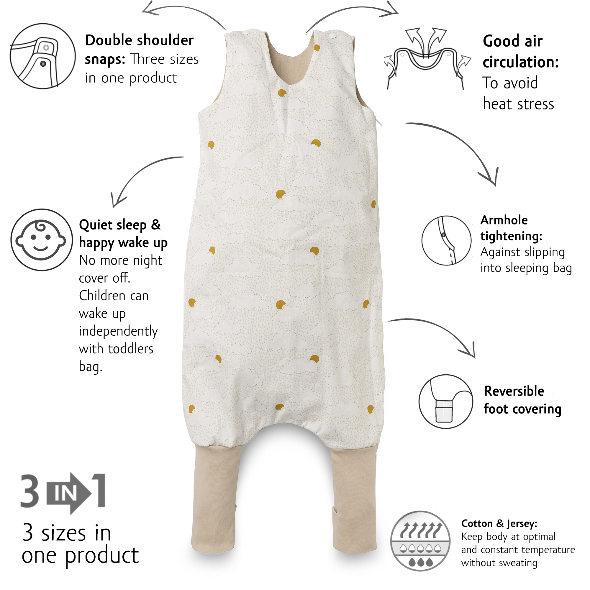 Koncept “capsule” garderobe za smanjenje nepotrebnih stvari u vašem ormaru Inovativnim dizajnom omogućeno je nošenje kroz više veličina, čime se produžuje vrijeme korištenja proizvoda GOTS „organic” certificirani proizvod, od uzgoja organskog pamuka do proizvodnje finalnog proizvoda. Svi radni procesi su revidirani i certificirani od strane međunarodnog neovisnog certifikacijskog tijela kako bismo zaštitili naš održivi okoliš. 0,5 TOG termo vreća za spavanje za malu djecu Odjeća za spavanje i vreće za spavanje prilagođene vanjskoj temperaturi pomoći će osigurati stabilnu noćnu temperaturu za vašu bebu. Upotrijebite našu web ili mobilnu aplikaciju kako biste lakše sastavili odgovarajuću kombinaciju za spavanje. Korištenje dobro odabrane vreće za spavanje za malu djecu može smanjiti često noćno znojenje. Stil: 3 u 1, s tri veličine podesivih kopči za ramena i otvor za ruke. Vreća za spavanje bez rukava za malu djecu s bočnim i gornjim otvorima. Prozračni dizajn bez rukava sa širokim otvorima na ramenima i vratu. Nogavice koje se mogu skratiti i produžiti po potrebi
