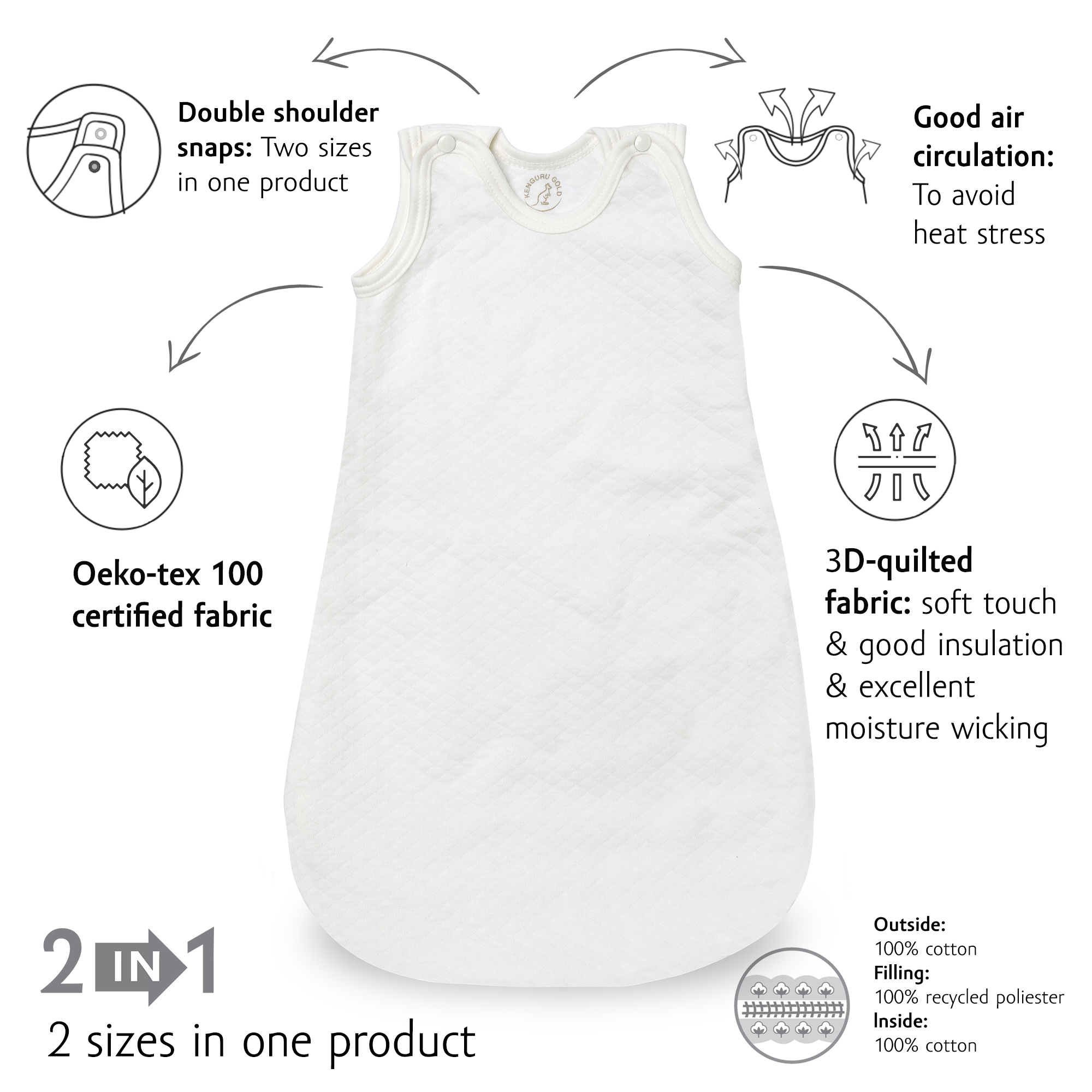 Koncept “capsule” garderobe za smanjenje nepotrebnih stvari u vašem ormaru Inovativnim dizajnom omogućeno je nošenje kroz više veličina, čime se produžuje vrijeme korištenja proizvoda GOTS „organic” certificirani proizvod, od uzgoja organskog pamuka do proizvodnje finalnog proizvoda. Svi radni procesi su revidirani i certificirani od strane međunarodnog neovisnog certifikacijskog tijela kako bismo zaštitili naš održivi okoliš. 1 TOG izolirana vreća za spavanje Odjeća za spavanje i vreće za spavanje prilagođene vanjskoj temperaturi pomoći će osigurati stabilnu noćnu temperaturu za vašu bebu. Upotrijebite našu web ili mobilnu aplikaciju kako biste lakše sastavili odgovarajuću kombinaciju za spavanje. Upotrijebite vreću za spavanje kako biste spriječili nesreće s dekama – nema više deka koje kližu na glavu vašeg djeteta Važno pravilo odijevanja je da veličina vrata vreće za spavanje nikada ne smije biti veća od veličine bebine glave, kako bi se spriječilo da bebina glava sklizne u vreću za spavanje tijekom spavanja. Uvijek koristite vreću za spavanje koja odgovara veličini vaše bebe i koristite preporučenu metodu patentiranja za veličinu. Stil: vreća za spavanje bez rukava s patentnim zatvaračem na dnu i sa strane 2-u-1 podesiv u dvije veličine Prozračni dizajn bez rukava sa širokim izrezima na ramenima i vratu