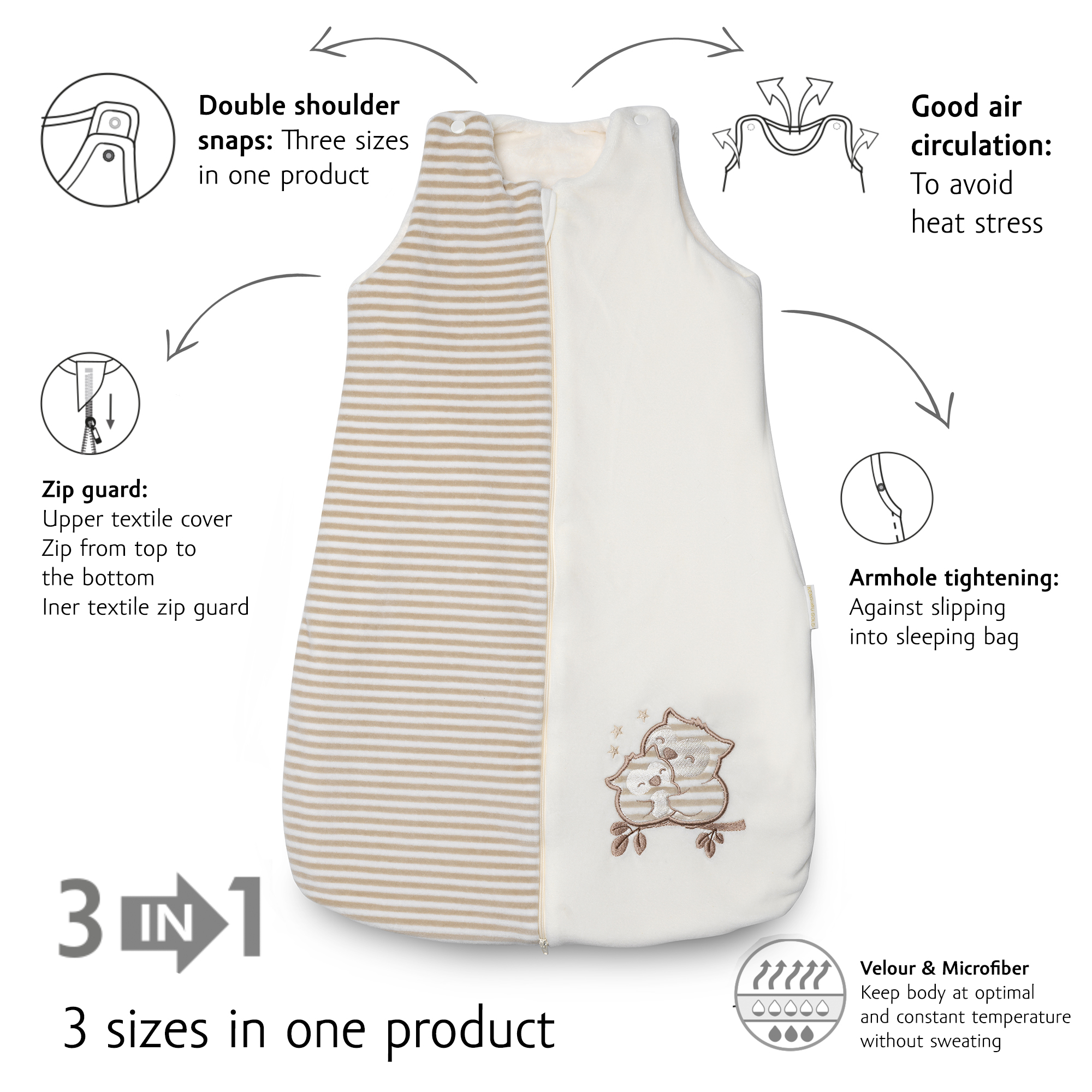 Koncept “capsule” garderobe za smanjenje nepotrebnih stvari u vašem ormaru Inovativnim dizajnom omogućeno je nošenje kroz više veličina, čime se produžuje vrijeme korištenja proizvoda GOTS „organic” certificirani proizvod, od uzgoja organskog pamuka do proizvodnje finalnog proizvoda. Svi radni procesi su revidirani i certificirani od strane međunarodnog neovisnog certifikacijskog tijela kako bismo zaštitili naš održivi okoliš. 2.5 TOG izolirana vreća za spavanje Odjeća za spavanje i vreće za spavanje prilagođene vanjskoj temperaturi pomoći će osigurati stabilnu noćnu temperaturu za vašu bebu. Upotrijebite našu web ili mobilnu aplikaciju kako biste lakše sastavili odgovarajuću spavaćicu Upotrijebite vreću za spavanje kako biste spriječili „nesreće s dekama” – nema više deka koje kližu na glavu vašeg djeteta Važno pravilo odijevanja je da veličina vrata vreće za spavanje nikada ne smije biti veća od veličine bebine glave, kako bi se spriječilo da bebina glava sklizne u vreću za spavanje tijekom spavanja. Uvijek koristite vreću za spavanje s patentiranim dizajnom koji odgovara bebinoj dobi i veličini. Gornji i unutarnji patentni zatvarač sa zaštitom i patentni zatvarač koji se otvara odozgo prema dolje štite nježnu bebinu kožu od manjih ozljeda. Stil: 3 u 1 vreća za spavanje bez rukava, podesiva u tri veličine s patentnim zatvaračem sprijeda Prozračni dizajn bez rukava sa širokim otvorima na ramenima i vratu.