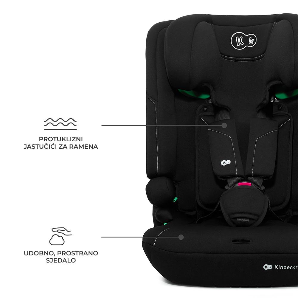 Kinderkraft I-COMFY je 3u1 autosjedalica koja raste zajedno s vašim djetetom – namijenjena djeci visine od 76 do 150 cm (otprilike od 15 mjeseci do 12 godina). U skladu je sa strogim standardom ECE R129 i-Size, koji uključuje bočne testove sudara. Zahvaljujući EASY GROW sustavu, moguće je istovremeno podešavanje naslona za glavu i pojaseva, što olakšava prilagodbu sjedalice visini djeteta.
