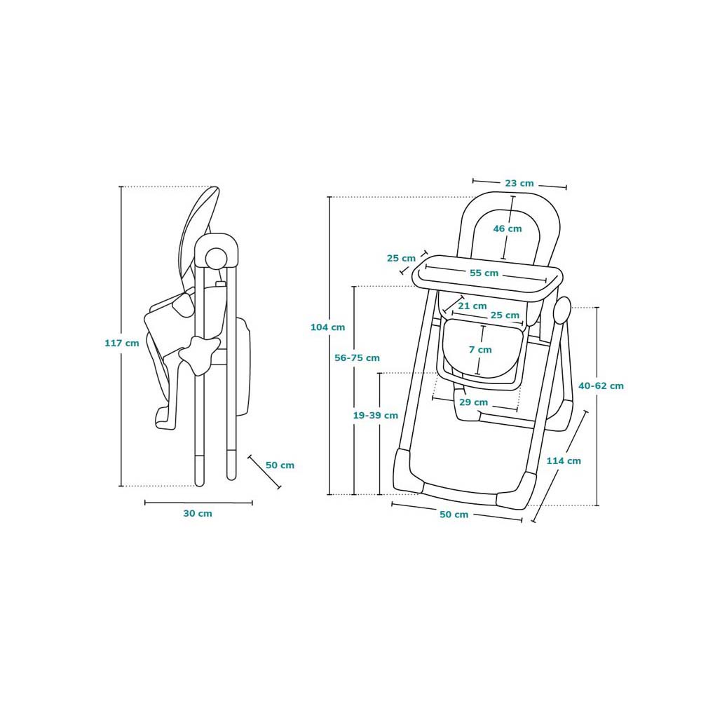 Ima podešavanje visine sjedala u 6 razina što vam omogućuje prilagođavanje stolu i dolazi s podešavanjem pladnja za hranu.