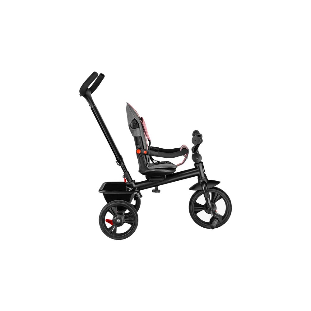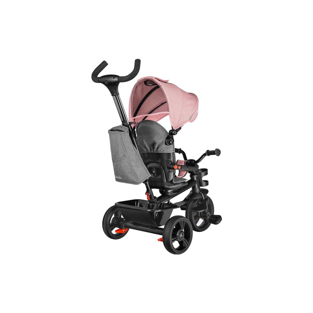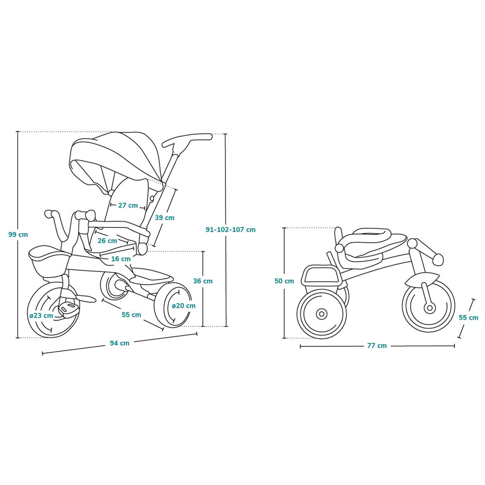 Tricikl s prednjim ili stražnjim sjedištem. Preklopljen krović i oslonac za noge pružaju udobnost djeci, dok pojasevi osiguravaju sigurnost.