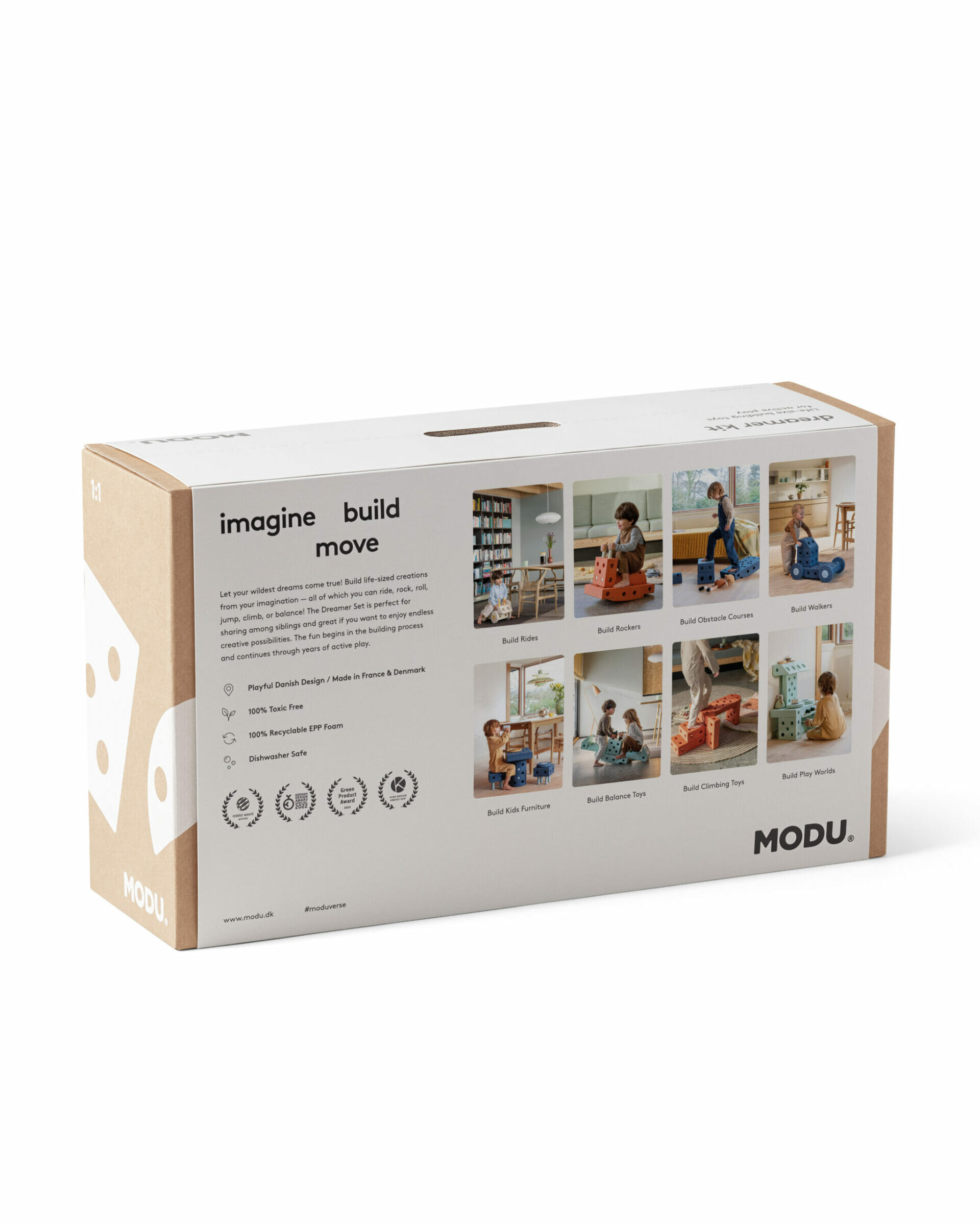 Napravite više od 25 jedinstvenih kreacija u životnoj veličini s najvećim MODU starter kompletom – s tim kreacijama djeca se mogu voziti, ljuljati, kotrljati, skakati, penjati se i balansirati! Dreamer set savršen je za zajedničku igru mališana ili za uživanje u beskrajnim kreativnim mogućnostima. Napravite hodalicu za svog mališana dok se vaše najstarije dijete vozi ili probudite inženjera u sebi slažući složene kreacije – poput kuhinje ili tobogana. Igra počinje već pri procesu izgradnje kreacija i nastavlja se kroz godine aktivne igre.