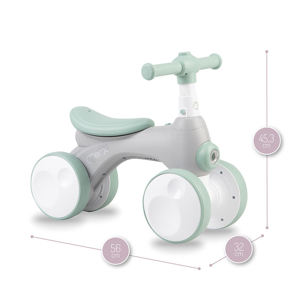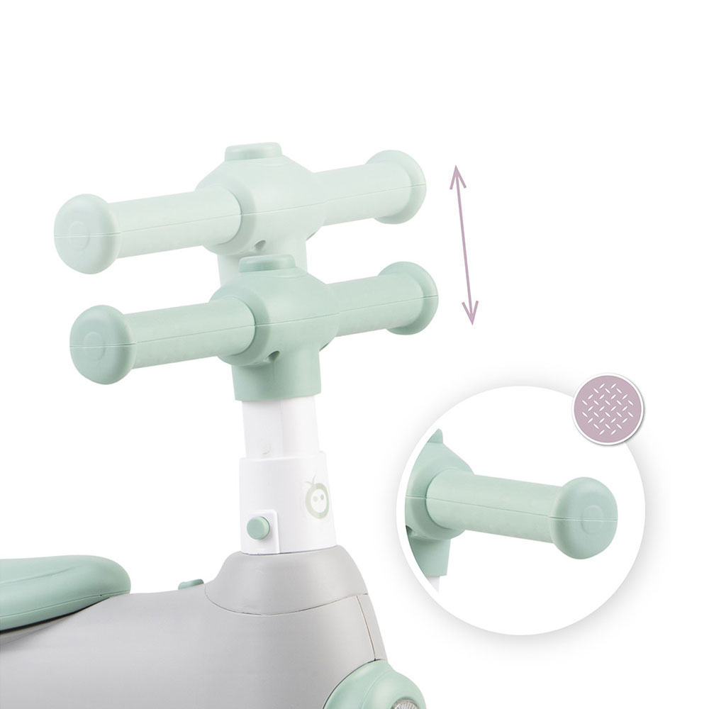 MoMi TOBIS nije samo atraktivan zbog svojih funkcija, već je i vrlo praktičan i siguran te pomaže u razvoju motoričkih sposobnosti. Na upravljaču se nalaze jastučići protiv klizanja, koji jačaju stisak djeteta. Upravljač ima podešavanje visine u 3 točke, tako da ga možete prilagoditi svom djetetu.