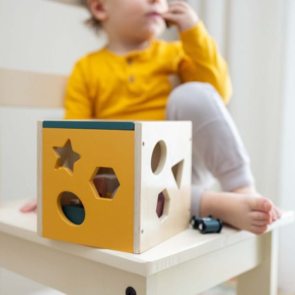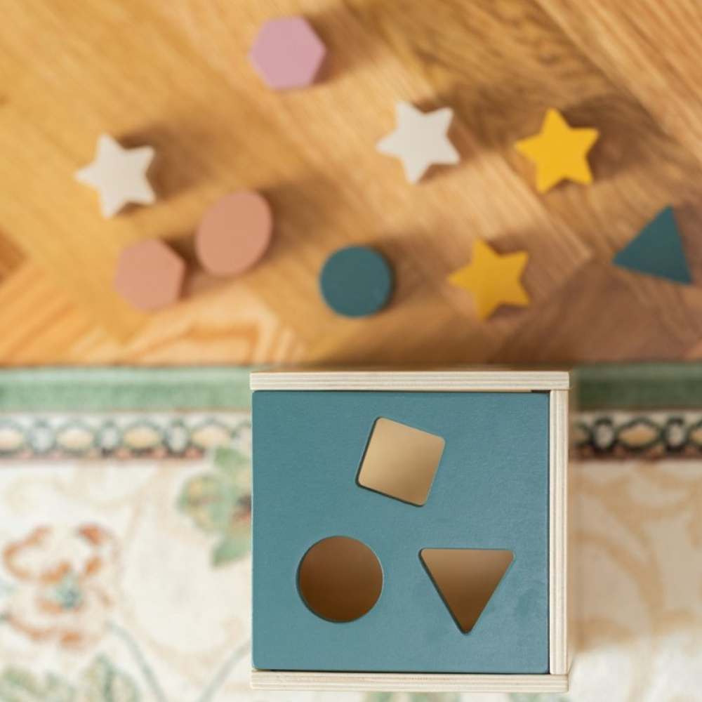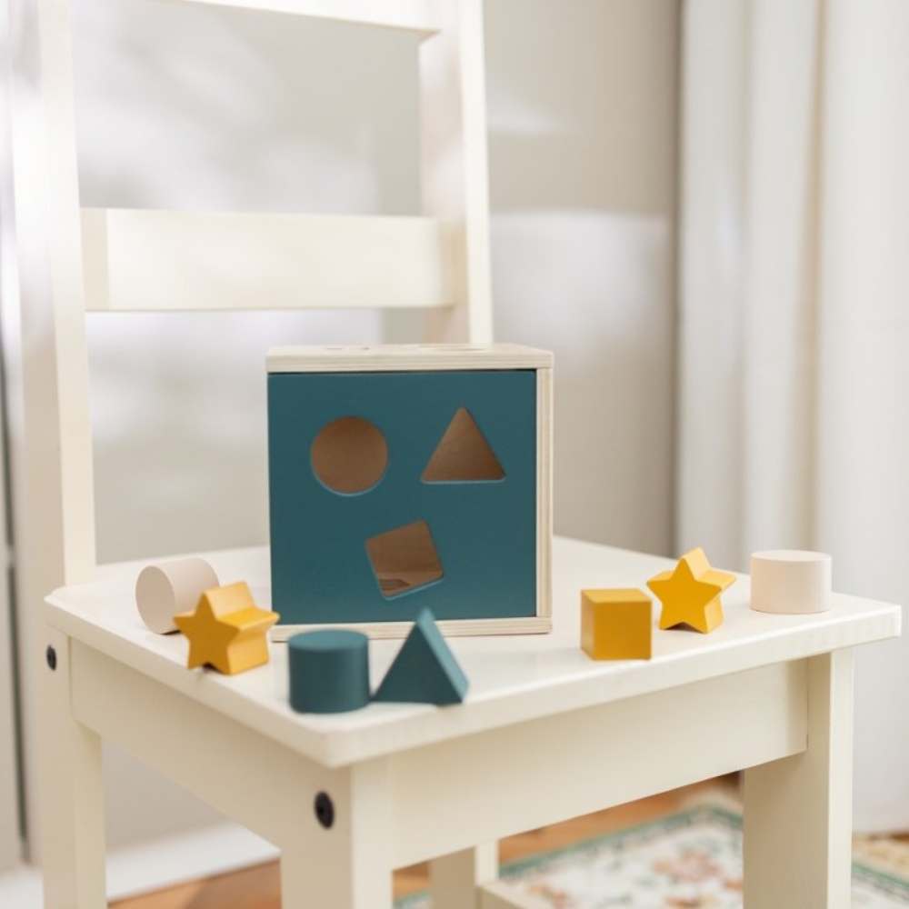 Set uključuje drvenu kocku s četiri strane za sortiranje i 12 šarenih blokova različitih oblika , poput trokuta, zvijezde, kvadrata, romba ili kruga.