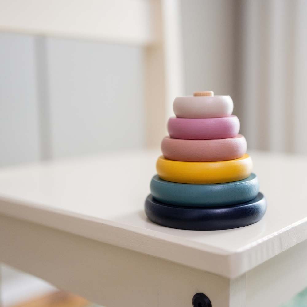 Piramida se sastoji od 6 šarenih kolutića koje dijete kolcem postavlja na postolje.
