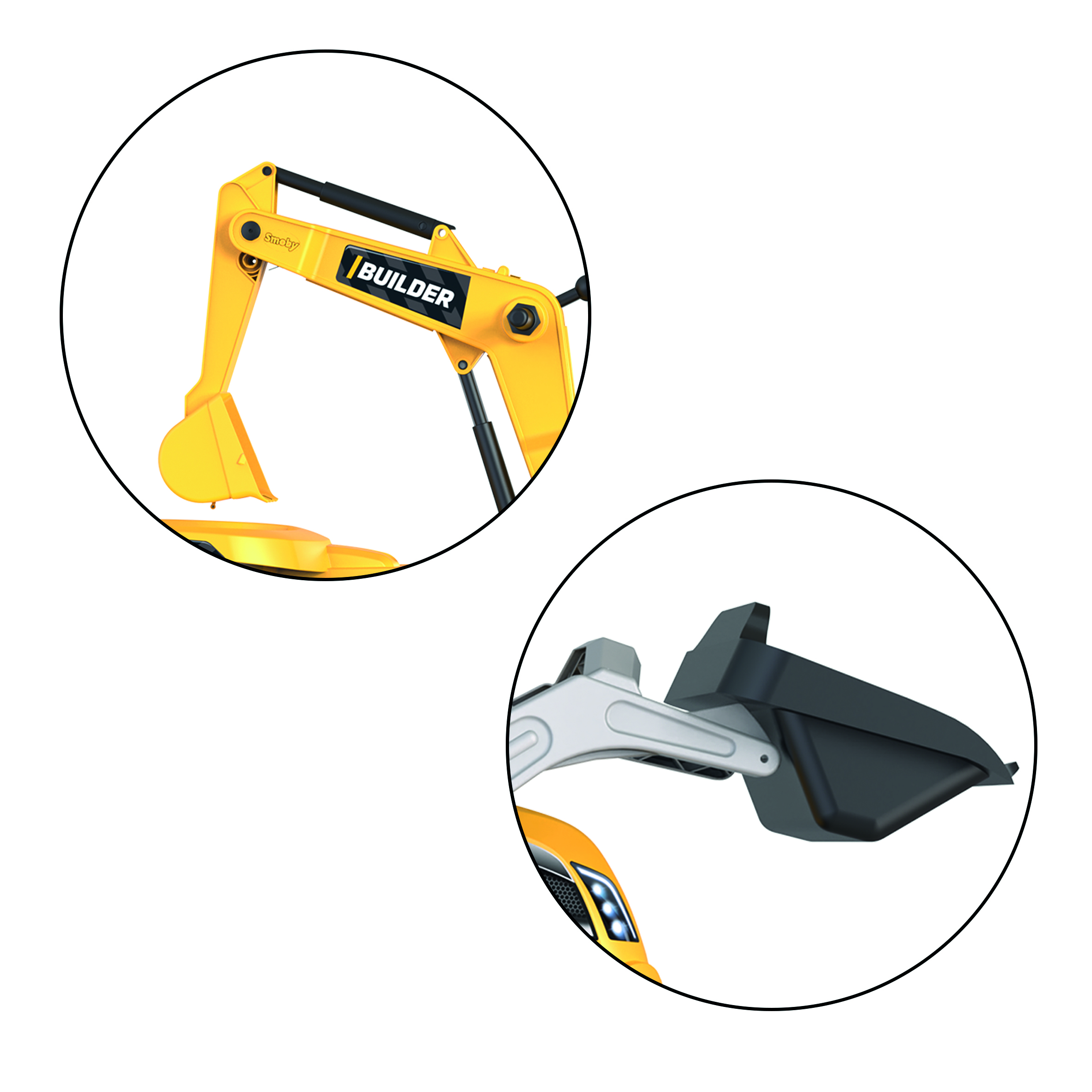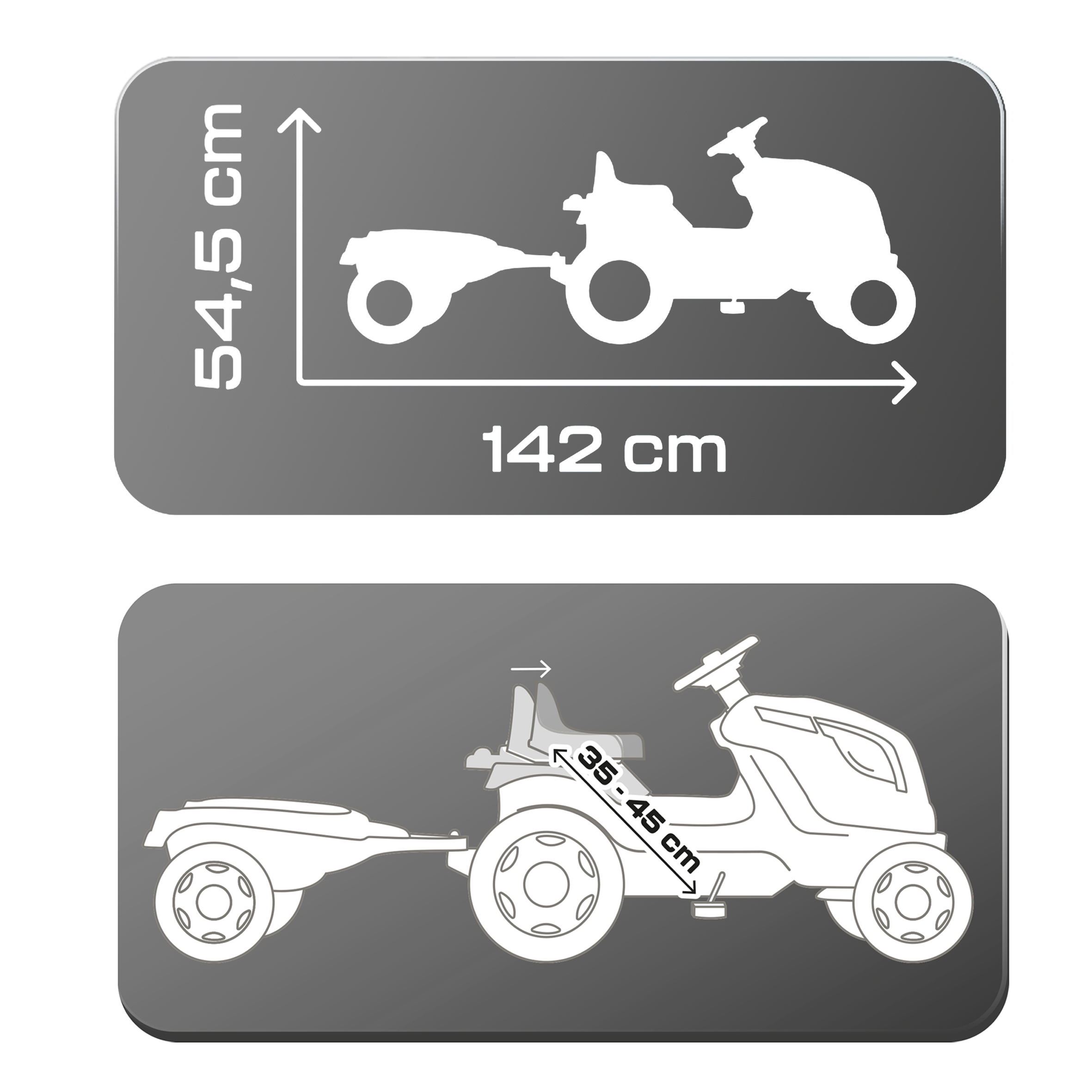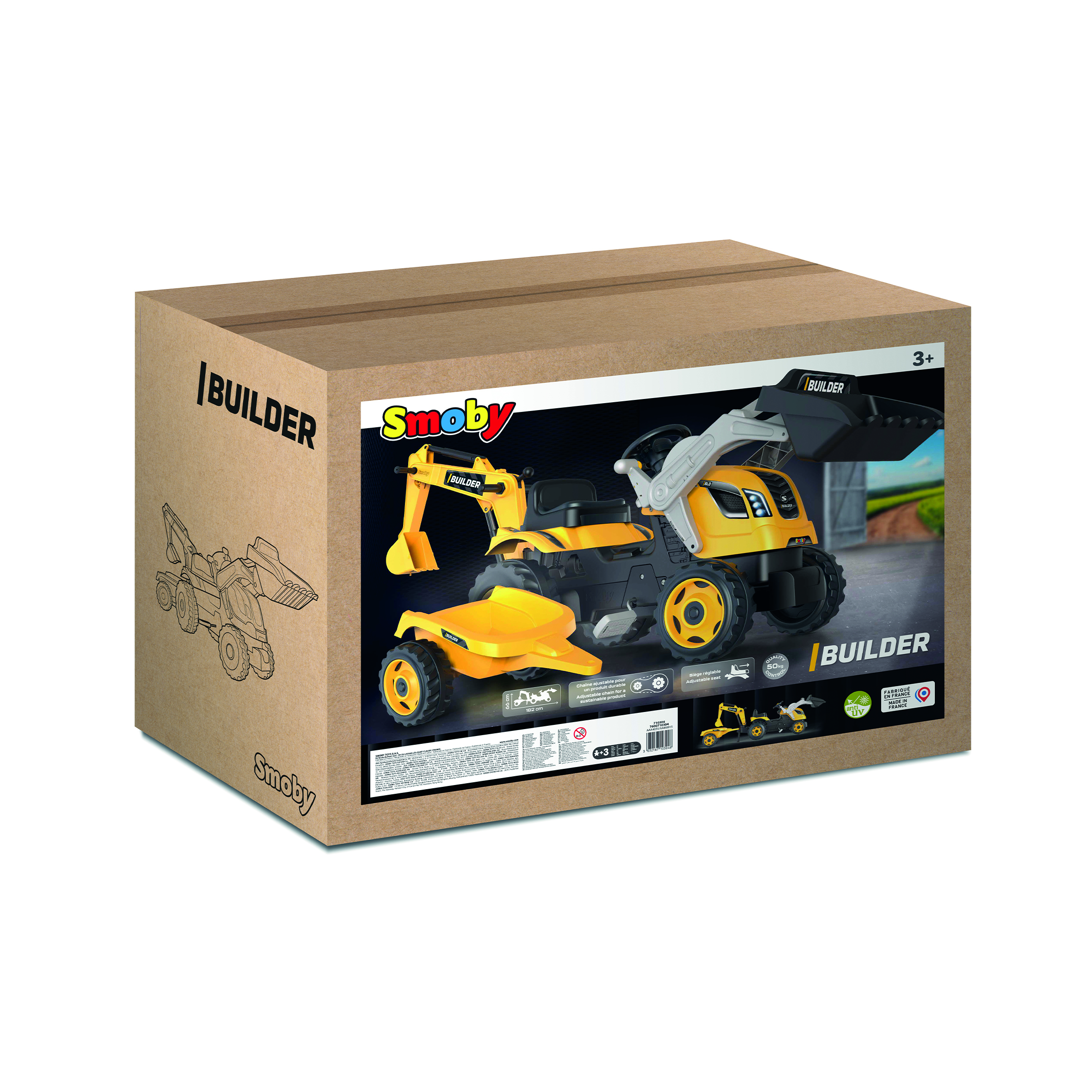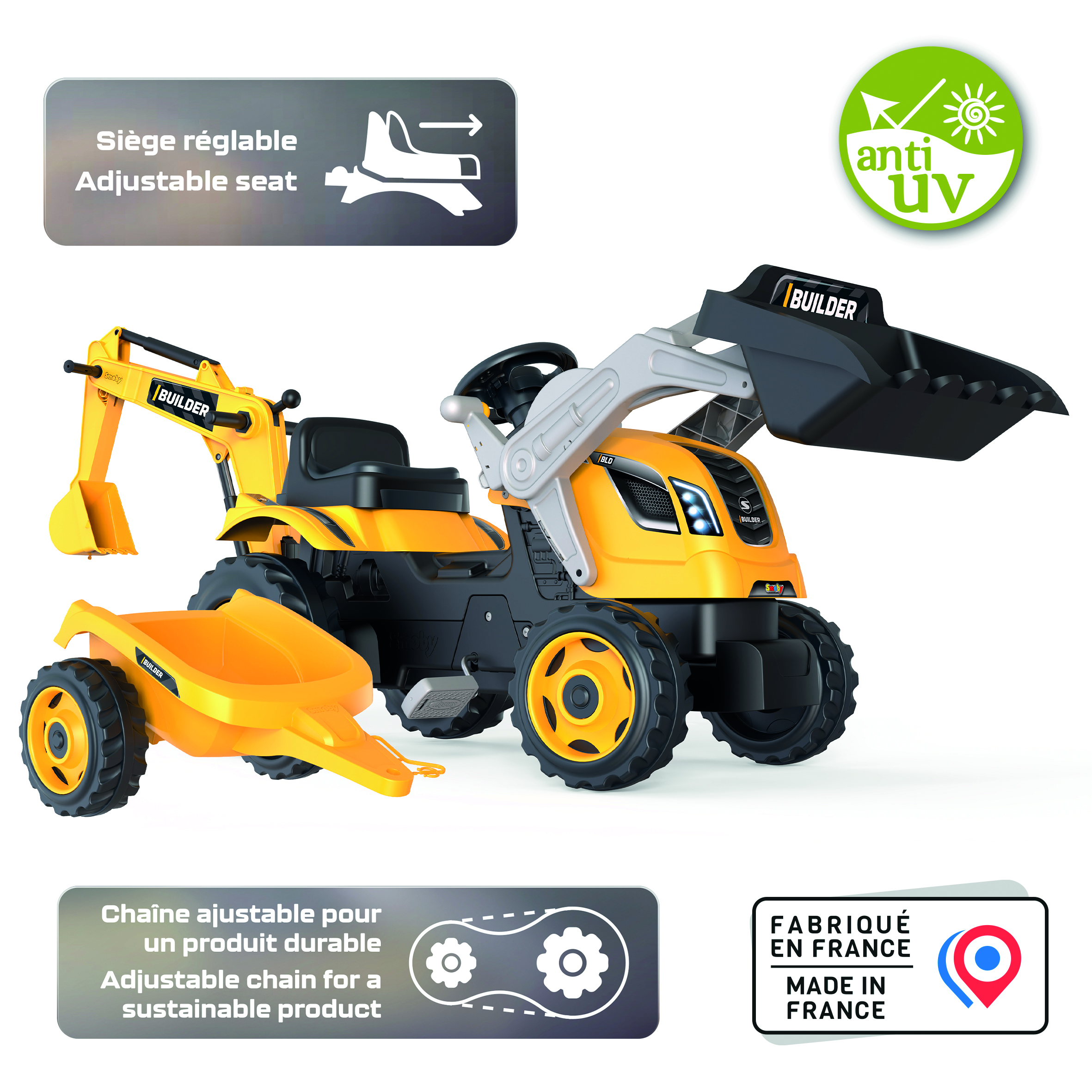 Koje dijete se ne voli igrati građevinara i traktorista?Traktor Smoby ispunit će san svakog djeteta. Ovo je jedinstveni dječji traktor koji objedinjuje traktor s prikolicom, bager i kamion. Robusne je konstrukcije i izrađen je od najkvalitetnijih materijala te će trajati godine i godine korištenja.Dječji traktor ima pedale, a kotači se mogu kontrolirati pomoću volana. Izdržljivi materijali osiguravaju najveću sigurnost i kvalitetu. Na volanu je truba kojom mali traktoristi najavljuju svoj dolazak. Vožnja na dječjem traktoru je izuzetno udobna, zahvaljujući podesivom sjedalu. Sjedalo je ergonomski dizajnirano, djeca se neće umoriti ni dok dugo sjede.Dječji građevinski traktor upotpunjen je prikolicom na stražnjoj strani, što mu daje još realističniji izgled. Stražnja prikolica ima 2 kotača, koji se po želji mogu i skinuti. Djeca u njemu mogu prevoziti svoje igračke ili građevinski materijal. Još jedan sjajan detalj je ruka za utovar na prednjoj strani i funkcionalna kutija za utovar. Graditeljske igre nikad nisu bile zabavnije i realističnije.Vožnja traktora s pedalama je zabavna igra, ali pomaže i tjelesnom razvoju djeteta. Upravljanjem volanom djeca će razvijati finu motoriku, a guranjem pedala jačati mišiće nogu. Igra s traktorom također razvija dječju maštu.Traktor ima lančani pogon, a nosivost mu je 30 kg.Visina sjedala je 37 cm, tako da dijete sjedi visoko iznad tla.Dužina traktora je 180 cm.Pogodan je za djecu od 3 godine starosti.Svojstva